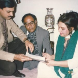 98-D Model Town. Yasmin and Naeem with Sarfraz for an interview.1980with yasmin